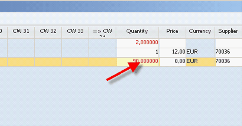 Quantity to be purchased / produced in purchasing units (Column header "quantity").