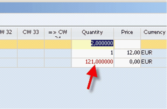 Collective purchase request/collective production request: Right-click on the time heading (CW x), which uses the order quantities for CW x. The requirements are entered in the quantity column. Only entries with corresponding requirements are displayed. For purchase orders the price and the supplier must be entered, for production request only the quantity. Then, the process can be started via "production request" or "order request".