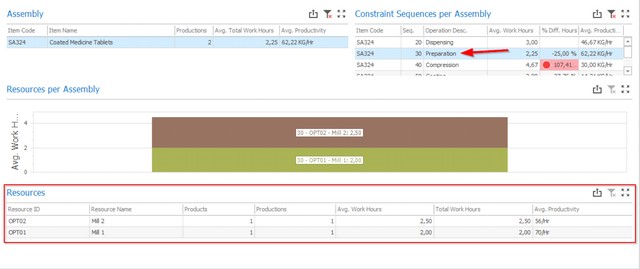 a)Item Code: Identification of the assembly; b)Seq.: ID of the routing position; c)Operation Desc.: Description of the routing position; d)Avg. Work Hours: Average net work hours registered for each routing position executed for the assemblies’ manufacturing. The net work hours are calculated by discounting the non-workable hours (according to the resources’ calendars) from the work hours when the time receipts last for more than one day. If the first start or last end happened before or after the resources’ available hours, those are not discounted and are considered as overtime (the discounts are only applied to the days in between the first and last days); e)% Diff. Hours: Percentual variation in between the productivity of the current routing position and the previous one. The differences are highlighted in a red scale, with a stronger red representing a higher variation. Additionally, all percentual differences higher than 50% are identified with a f)Avg. Productivity: How much of the assemblies’ unit of measures were produced during the total net work hours registered for each routing position (this grid does not consider different UoMs per routing position, the UoMs are read directly from the assembly).